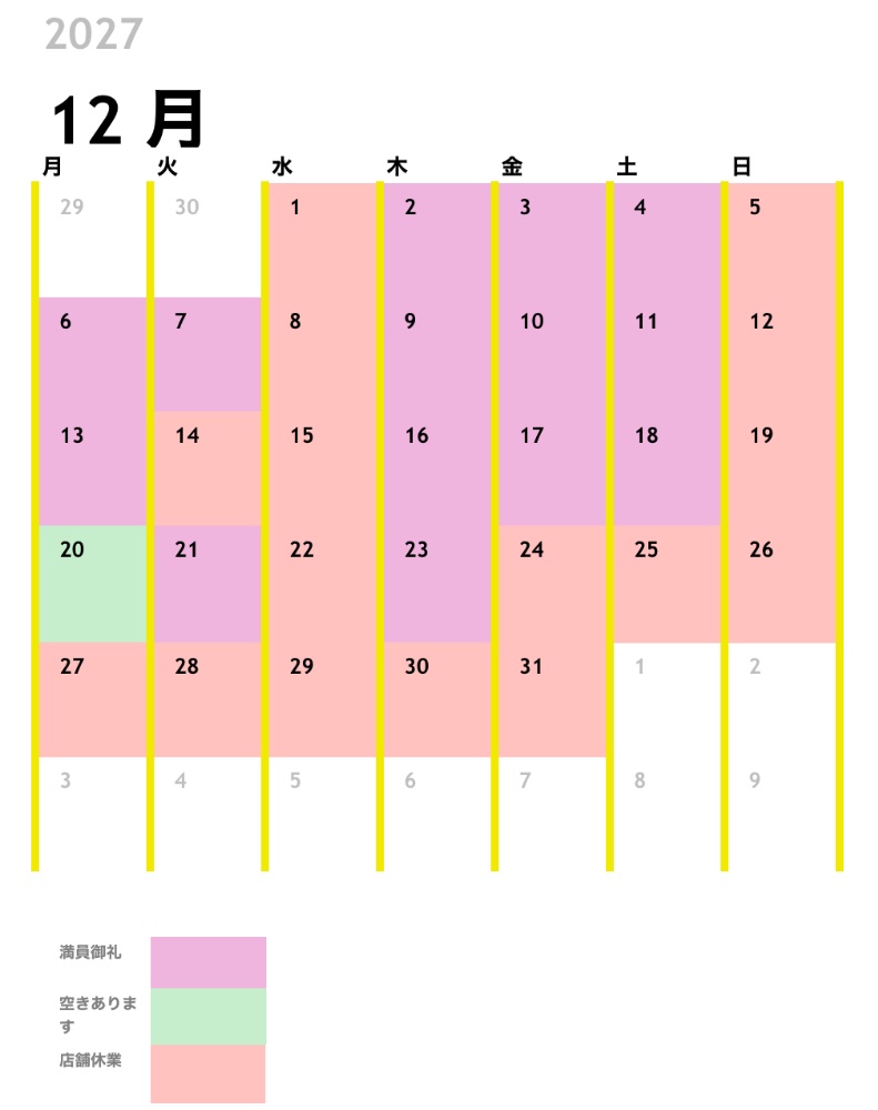 『休』『✖️』『➖』の場合: 満席となっております。次回のご利用をお待ちしております。